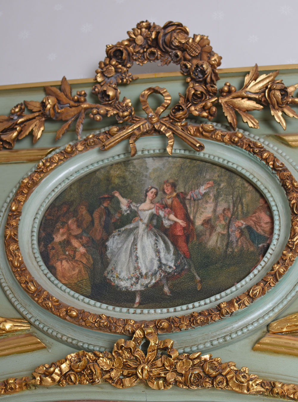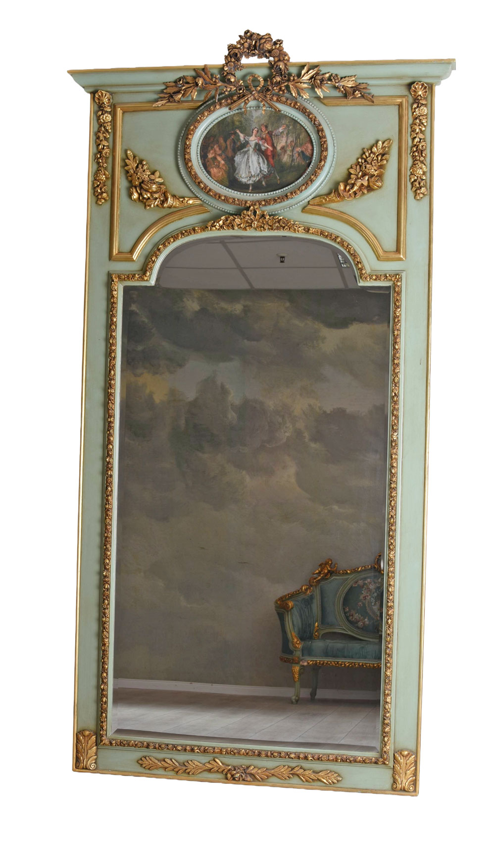 Der aufwendig gestaltete Rahmen besteht aus handgeschnitztem Holz und Stuck und ist mit prachtvollen barocken Ornamenten dekoriert. Die detailreiche Verarbeitung verleiht dem Spiegel eine eindrucksvolle historische Anmutung und macht ihn zu einem luxuriösen Dekorationsobjekt mit besonderem Charakter.