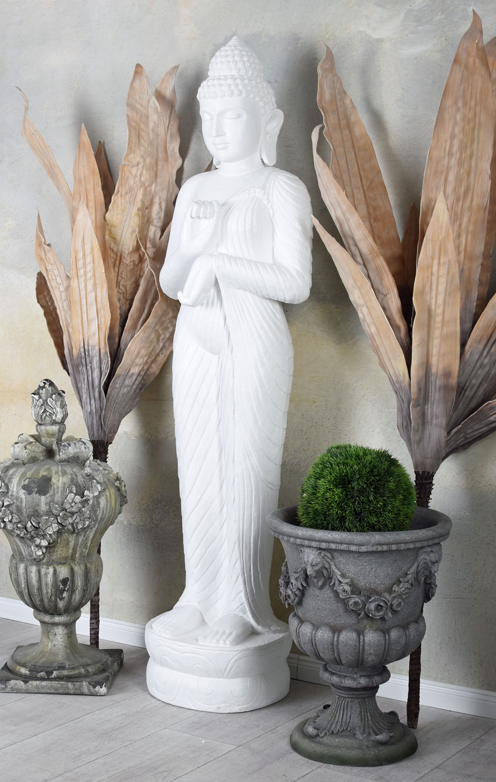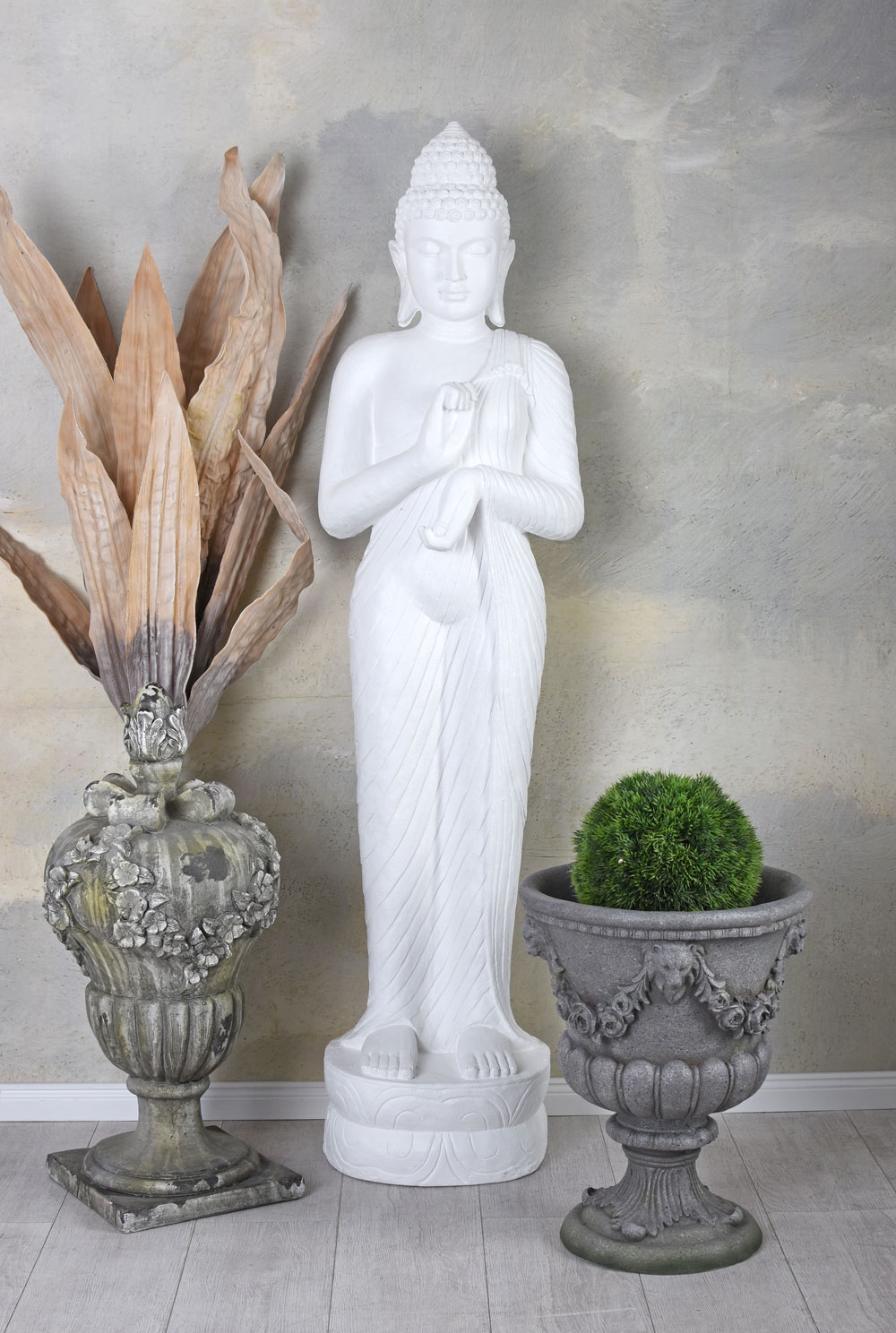 Mit einer beeindruckenden Gesamthöhe von ca. 160 cm besitzt die Buddha Figur eine monumentale Präsenz und wird zum eindrucksvollen Mittelpunkt jeder Dekoration. Ob im Wohnzimmer, Wintergarten, Eingangsbereich, auf der Terrasse oder im Garten – die Statue schafft überall eine ruhige und harmonische Atmosphäre.