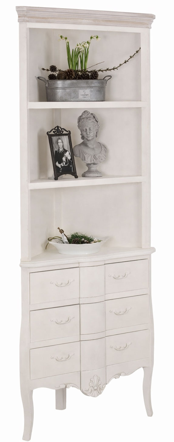 Romantisches Shabby Chic Eckregal im französischen Landhausstil. Weiß gekälkt, mit Schnitzereien und 3 Schubladen – stilvoller Vintage-Charme für Ihr Zuhause.