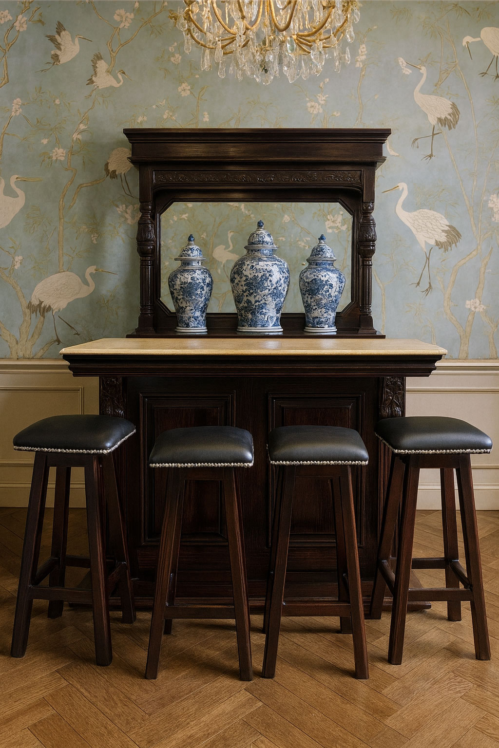 Erleben Sie britisches Pub-Flair zu Hause! Die imposante Hausbar „VILLA HEMINGWAY“ aus massivem Holz mit Marmorplatte, Rückwandbuffet und vier Barhockern verbindet nostalgischen Kolonialstil mit moderner Funktionalität – ein eindrucksvoller Eyecatcher für jeden Raum.