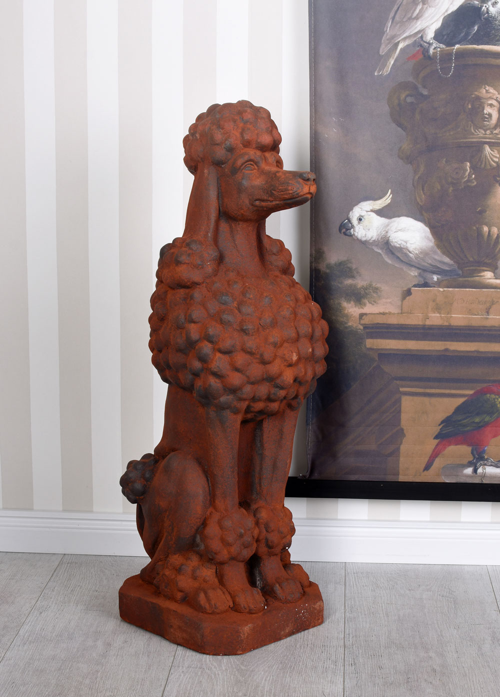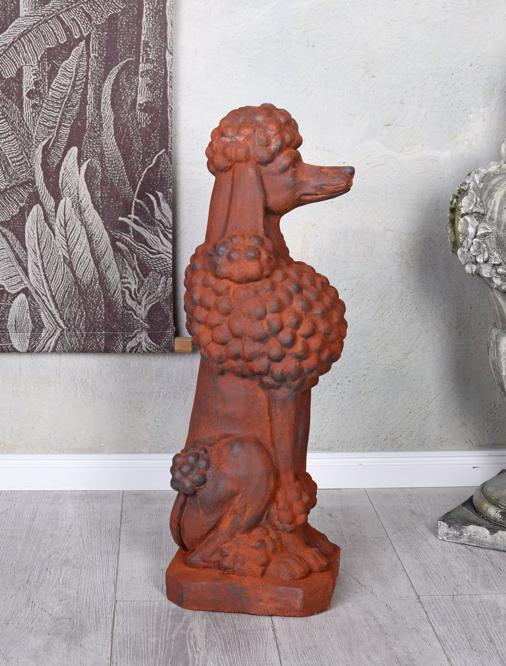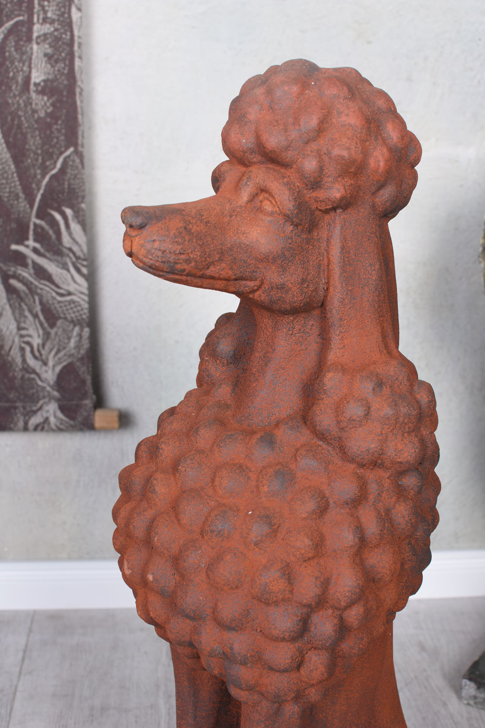 Die Hundeskulptur Schlosspark ist ein dekoratives Highlight für alle Liebhaber nostalgischer Garten- und Hausdekorationen. Die stattliche Pudel-Figur aus robustem Kunststein präsentiert sich in einer warmen Rostoptik, die an historische Torfiguren und herrschaftliche Parkanlagen erinnert. Die bewusst zurückhaltende Farbgebung verleiht der Figur eine edle, antikisierte Anmutung und harmoniert wunderbar mit Naturmaterialien, Steinmauern oder modernen Eingangsbereichen.