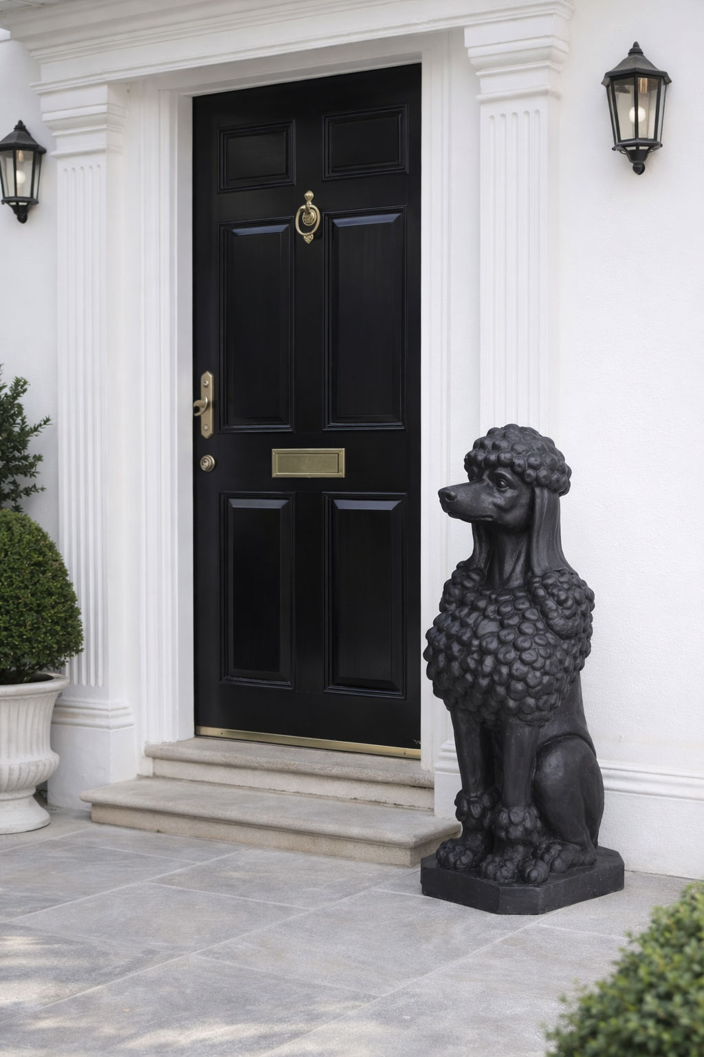 XXL-Pudel-Statue „Schlosspark“ aus schwarzem Kunststein im Landhausstil. H 67 × B 23 × T 23 cm – majestätischer Torwächter für Eingangsbereich, Balkon oder Garten. Lieferung ohne Deko.