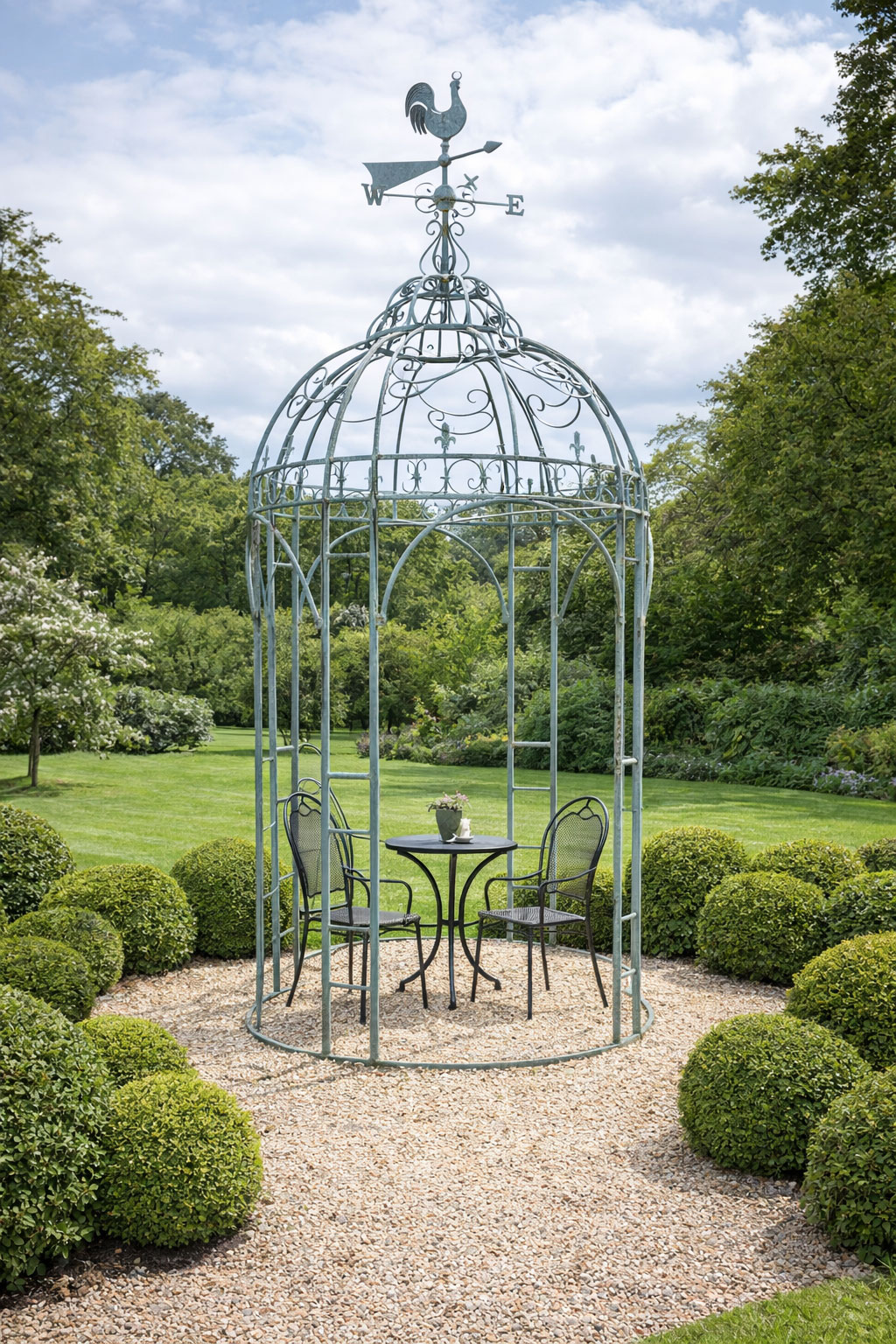 Als Rosenpavillon, Gartenhaus, Rankhilfe oder dekorativer Rückzugsort – dieser Pavillon bringt stilvolle Eleganz in jeden Außenbereich. Die Krönung bildet ein dekorativer Wetterhahn auf der Spitze.