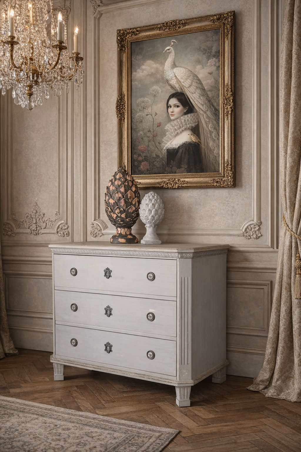Die Kommode „Schloss Haga“ verbindet den romantischen Charme des Gustavianischen Stils mit der lässigen Eleganz des Shabby Chic und wird so zu einem zeitlosen Möbelstück, das sowohl klassische als auch moderne Einrichtungen stilvoll ergänzt.