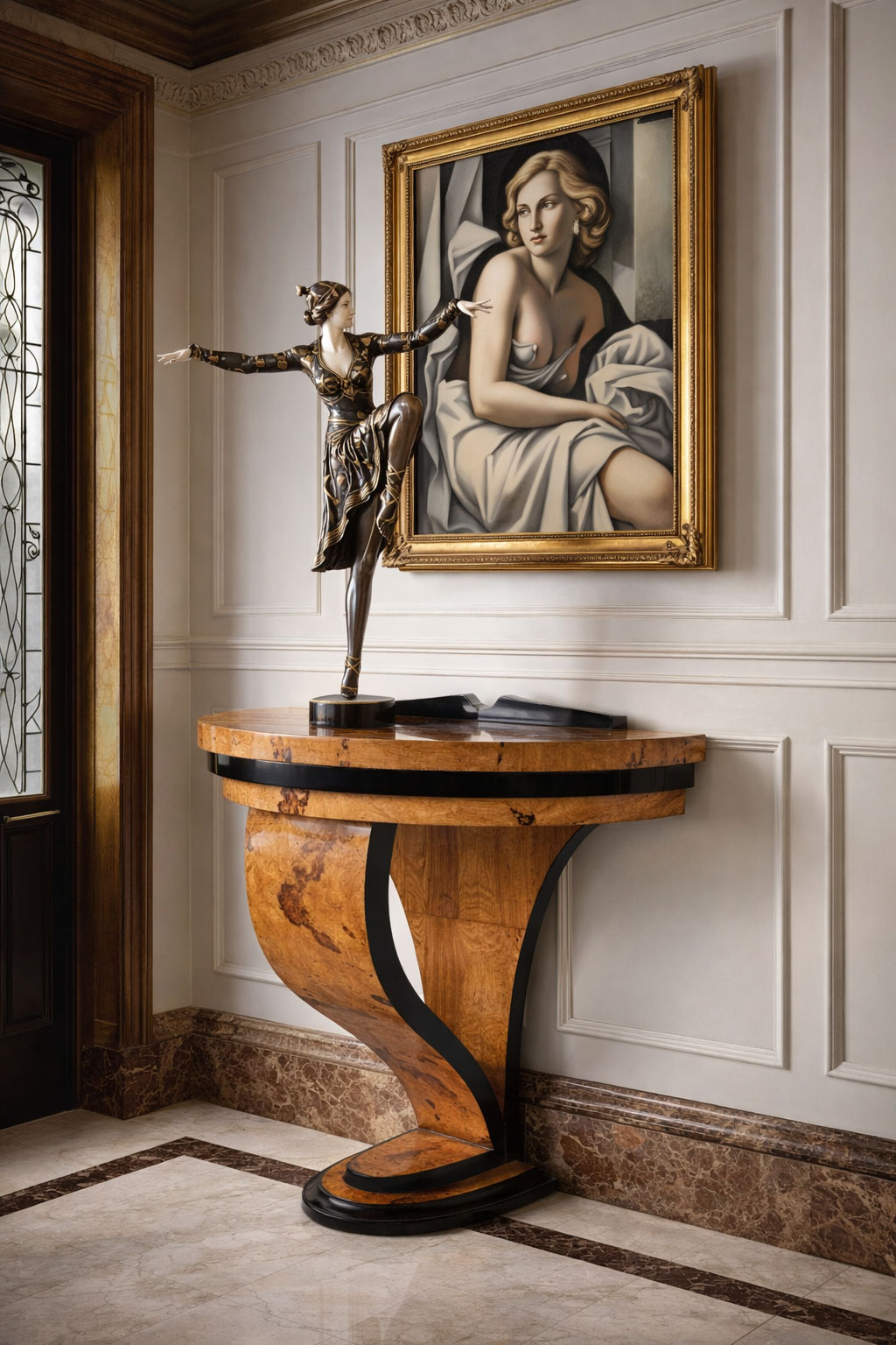 Eleganter Art-Déco-Konsolentisch aus Wurzelholz – 88 cm hoch, geometrisches Design mit glamourösem 20er-Jahre-Flair.