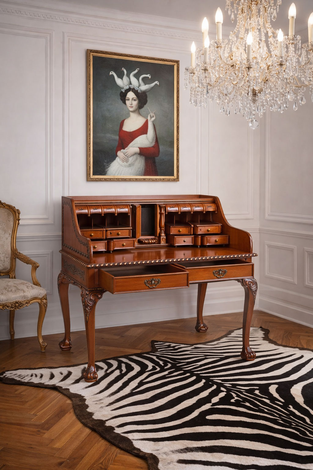 Der Kolonial Sekretär „Villa Hemingway“ ist ein Meisterstück klassischer Handwerkskunst und verleiht jedem Raum den repräsentativen Charme vergangener Epochen. Inspiriert von historischen Originalen, wurde dieser Rollsekretär aus massivem Mahagoniholz gefertigt und mit kunstvollen Schnitzereien versehen. Die warme, edle Holzfarbe und die feine Patina machen jedes Exemplar zu einem unverwechselbaren Unikat.