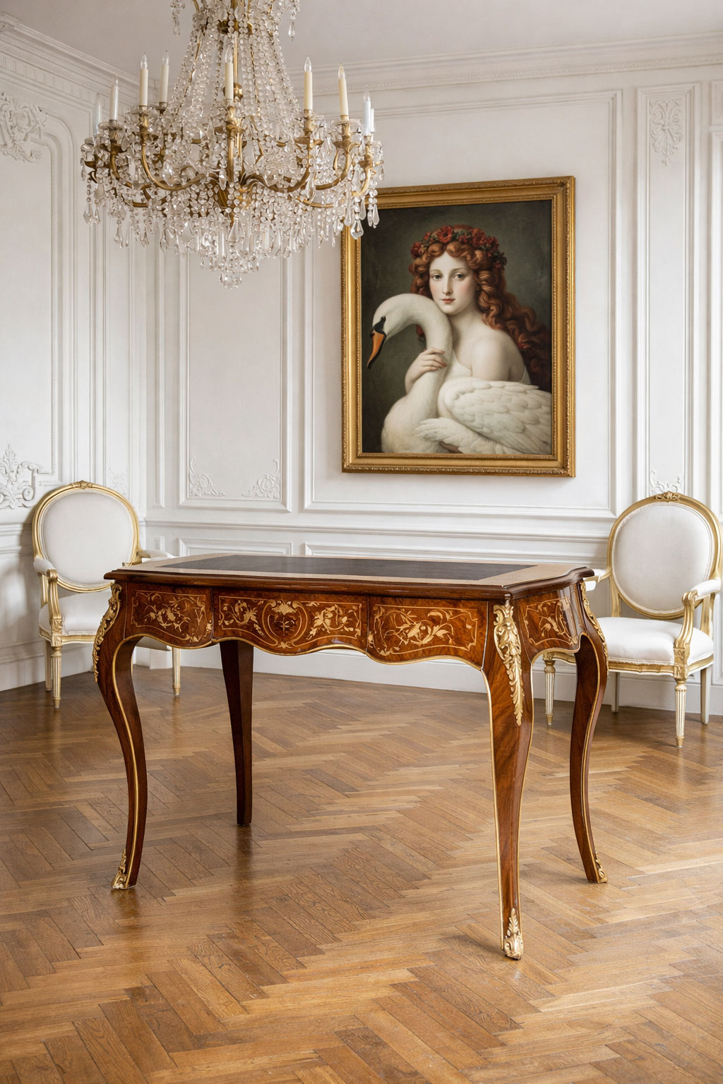 Veredeln Sie Ihr Arbeitszimmer mit barockem Charme: Der Intarsien Schreibtisch „CHATEAU DE VERSAILLES“ besticht durch aufwändige Intarsienarbeiten, edle Metallgriffe und eine praktische Schreibeinlage in Rot. Mit einer Höhe von ca. 80 cm und geräumigen Maßen von ca. 113 x 57 cm verleiht dieser Bürotisch Ihrem Ambiente einen Hauch königlicher Eleganz
