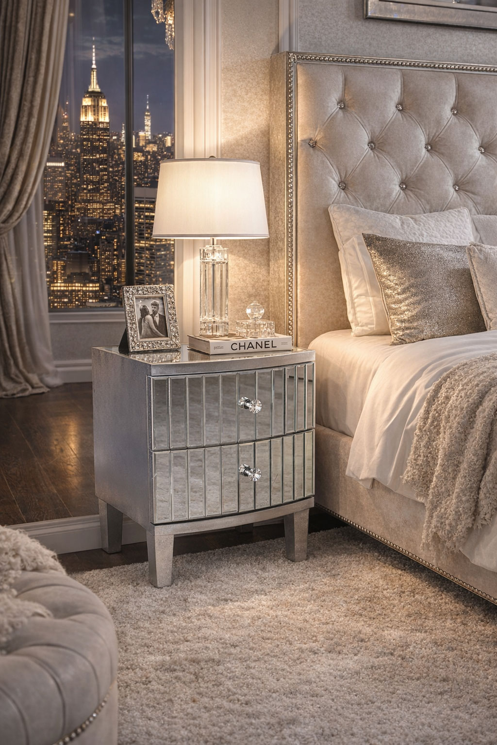 Die Nachtkommode „Hollywood Glamour“ verbindet verspiegeltes Design und praktische Schubladen zu einem eleganten Highlight im Schlafzimmer.