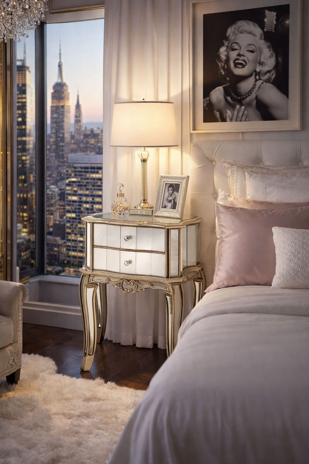 Ob als Nachttisch im Schlafzimmer, Beistellkommode im Wohnzimmer oder stilvolle Konsole im Eingangsbereich – die Nachtkommode „Hollywood Glamour“ verleiht jedem Raum eine luxuriöse Note.
