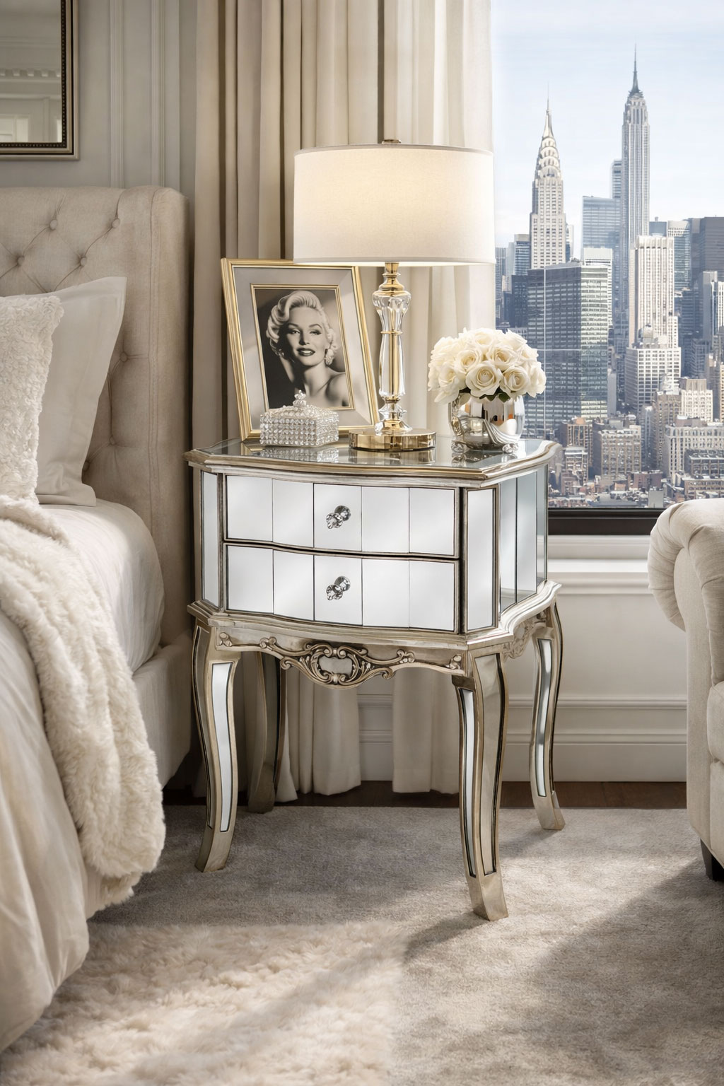 Luxuriöser Stil für Ihr Zuhause: Die verspiegelte Nachtkommode „Hollywood Glamour“ verbindet elegantes Design, glänzende Spiegeloberflächen und praktische Funktionalität – perfekt als stilvoller Nachttisch oder dekorative Konsole.