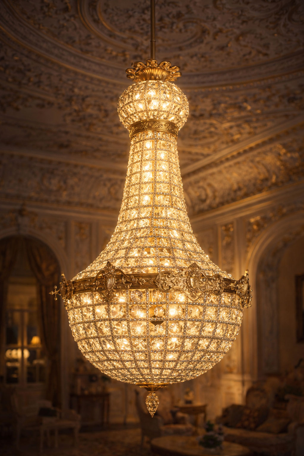 Besonders eindrucksvoll sind die zahlreichen facettierten Kristallbehang-Elemente, die das Licht auf elegante Weise brechen und funkelnde Reflexe erzeugen. Dadurch entsteht eine warme und luxuriöse Atmosphäre, die sowohl klassische als auch moderne Interieurs stilvoll ergänzt.