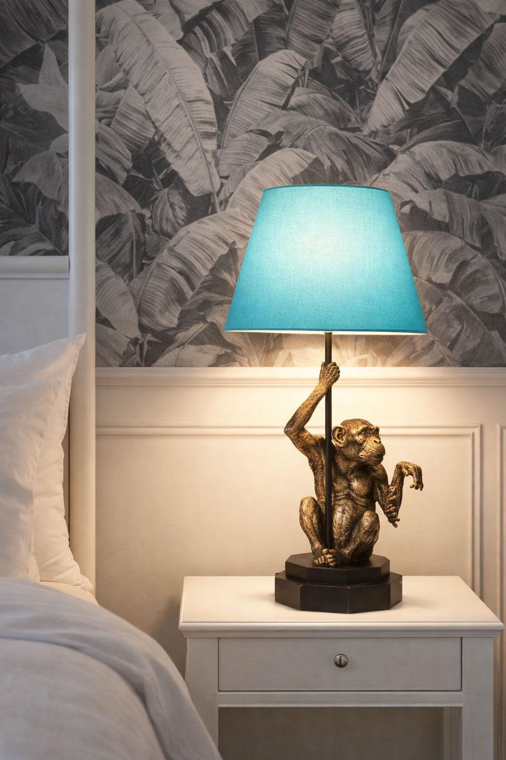Die Tischlampe „Monkey Loves You“ ist ein ausdrucksstarkes Wohnaccessoire, das exotischen Charme mit modernem Design verbindet.