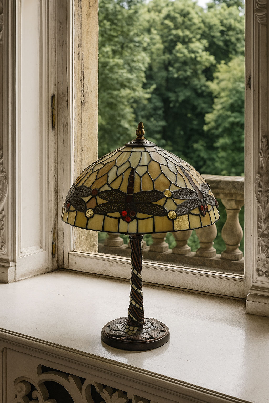Ihr prachtvoller Lampenschirm ist aus zahllosen, farbigen Glasstücken zusammengesetzt und wird von dekorativen Libellenmotiven geschmückt – ein zeitloses Symbol für Leichtigkeit und Naturverbundenheit.