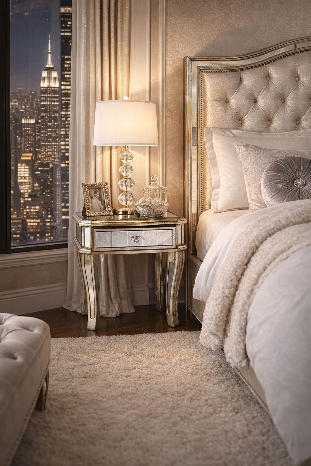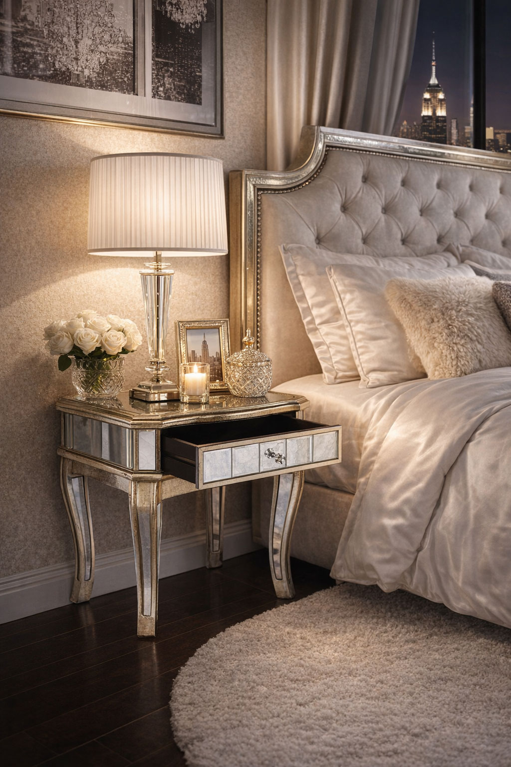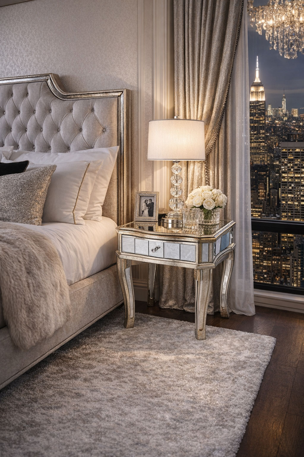 Der Sofatisch „Hollywood Glamour“ kombiniert Rokoko-Charme mit verspiegeltem Design zu einem luxuriösen Blickfang im Wohnzimmer.